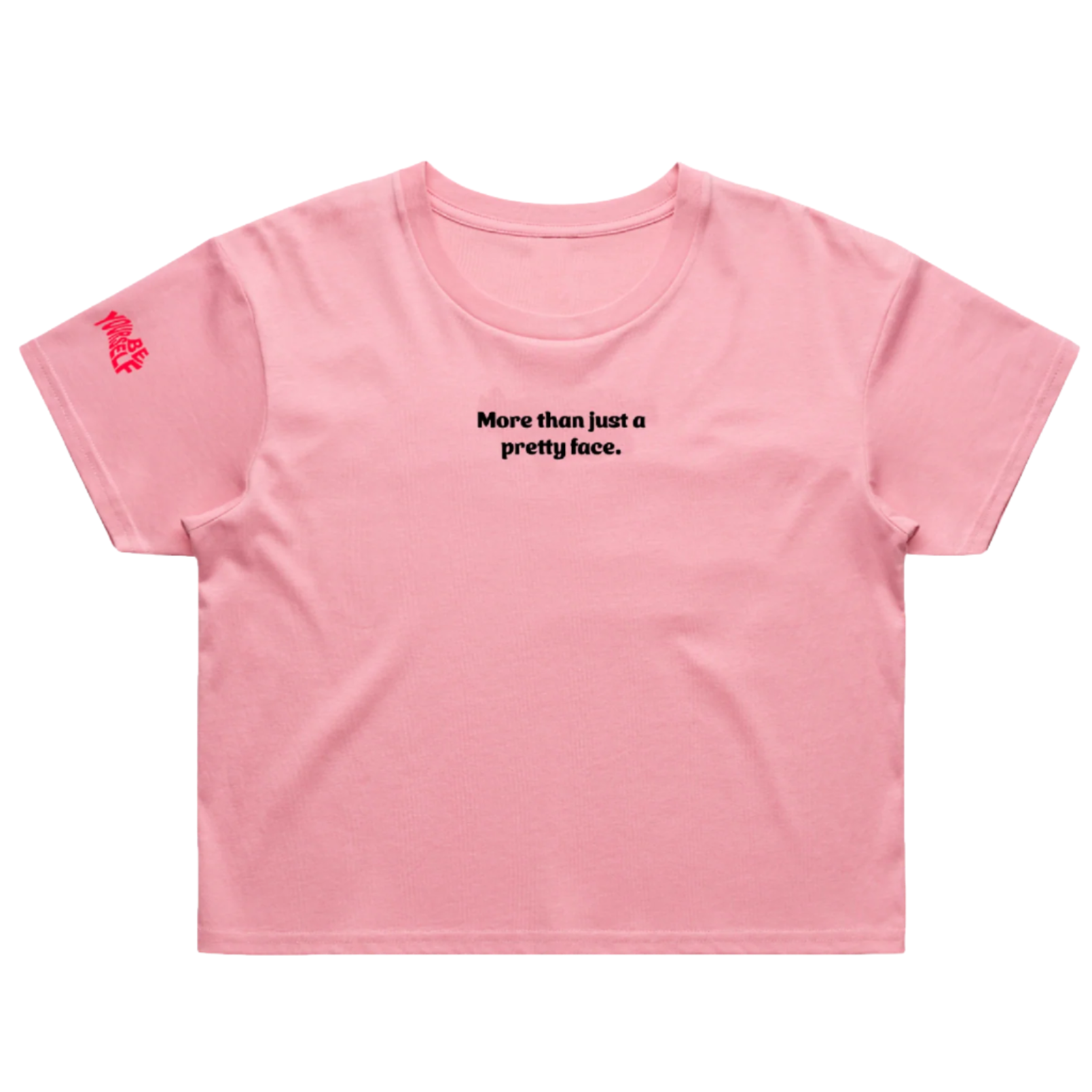 Our More Than Just a Pretty Face Crop Top is soft, comfortable, and designed to make a statement without saying too much. The minimalist embroidery across the chest keeps it classy, while the cropped fit adds just the right edge.